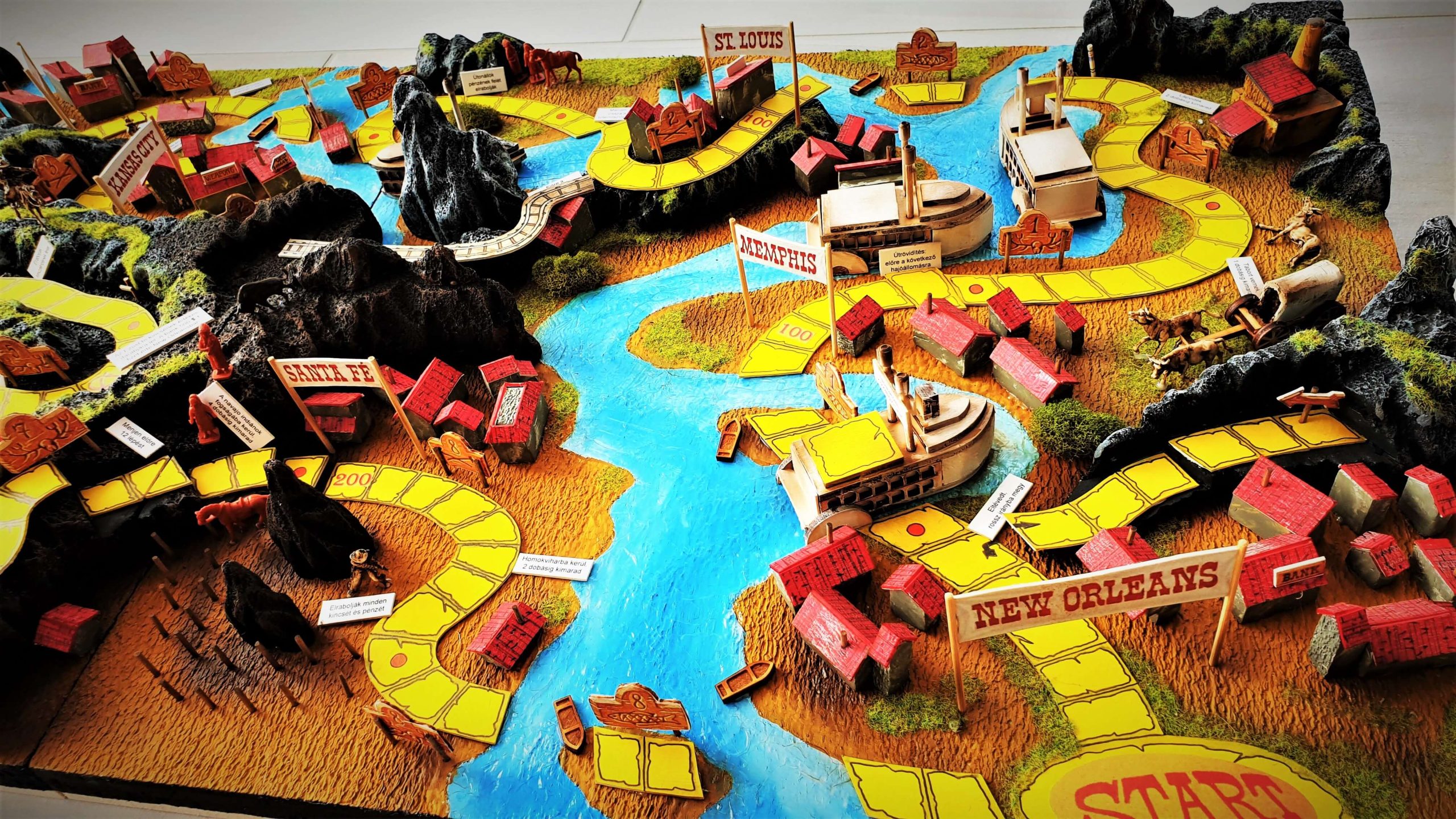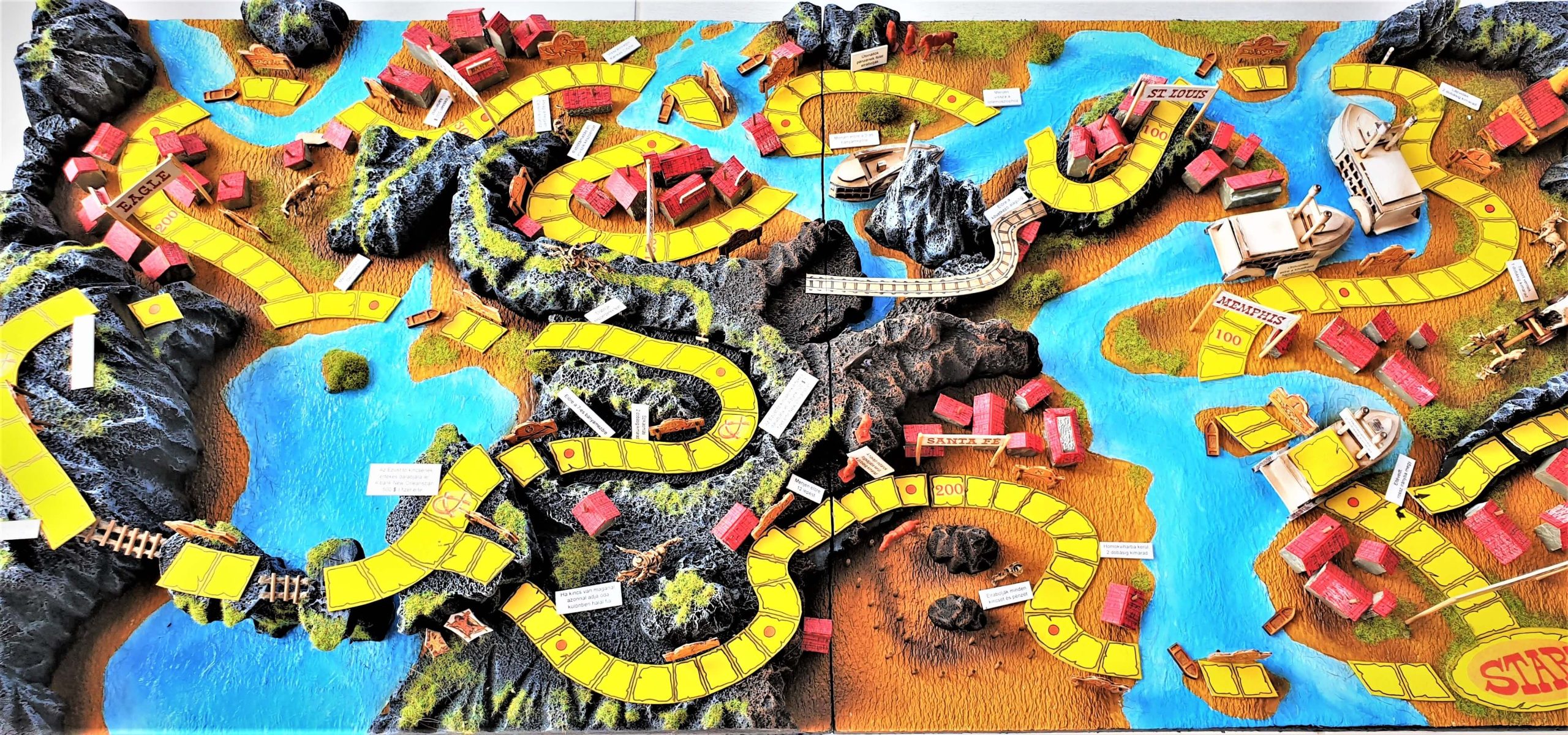 Az Ezüst-tó kincse társasjáték csodálatos táblája megelevenedik: indiánok, cowboyok, lovas szekér, városok.