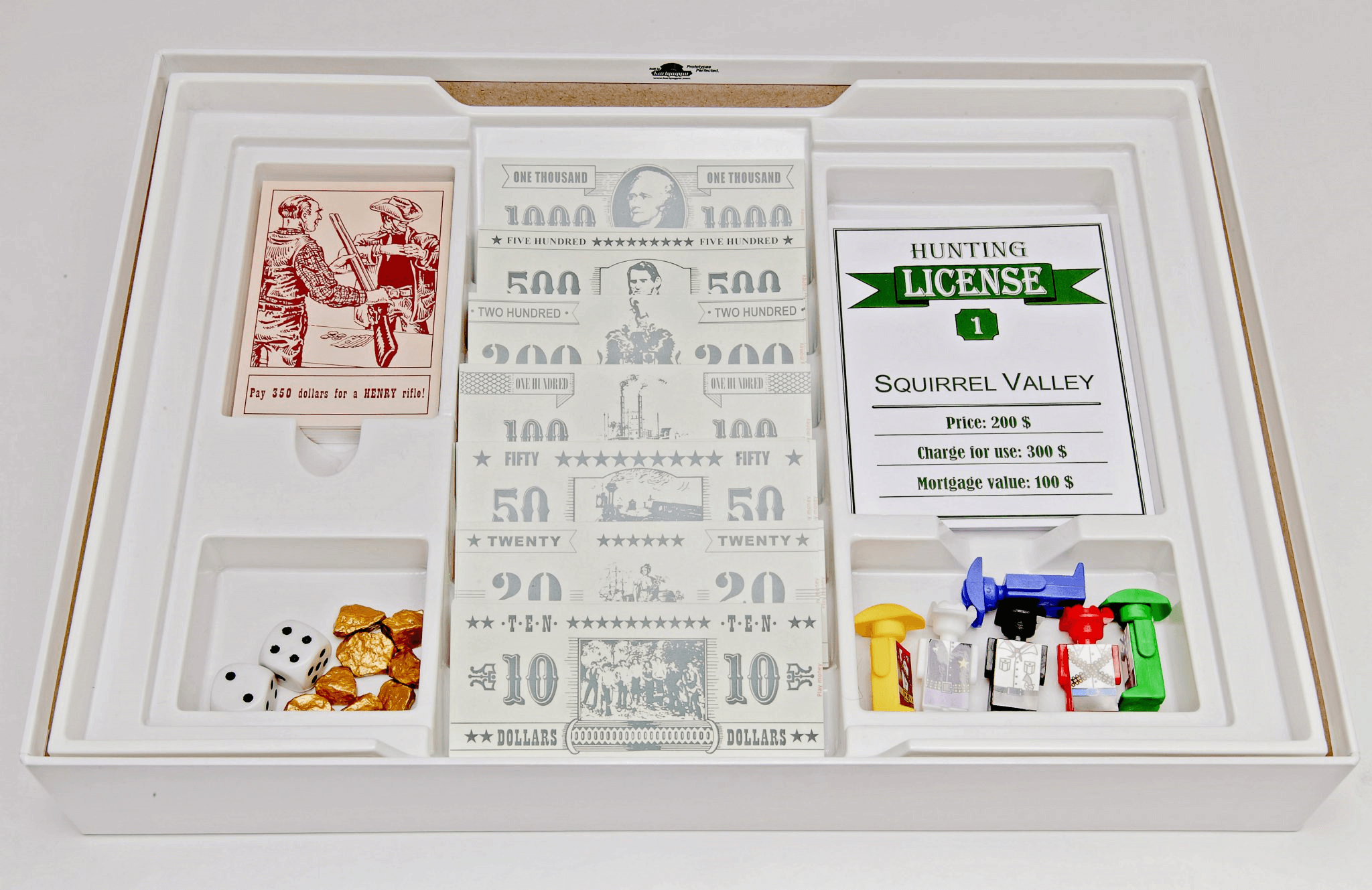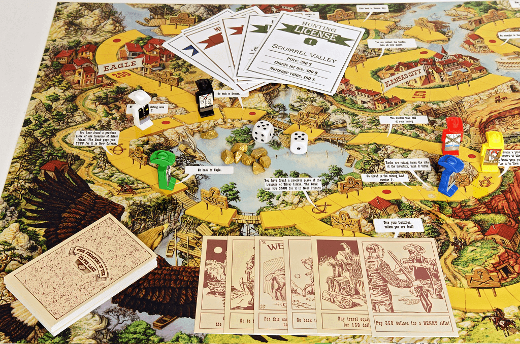 During the first half of the last century the blood-soaked field of the Far-East, the hunting grounds of the expelled Indians were populated by settlers. New towns were born, where many adventurers, soldiers of fortune even robbers were living. On the roads public security was equal to zero. Brave travelers, hunters, miners were much threatened. The players drop in to this venturesome world written by Karl May as well. Their goal is to pass through the marked direction at least five to six times amid many adventures and dangers and to gain as many mining, fishing and hunting fields as possible. In the fields where the treasure of the Silver Lake is hidden gold nuggets are found which are bought by the Bank of New Orleans presuming that the player is not robbed along the way. The winner is, who made the biggest fortune at the end.
